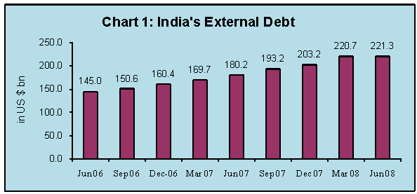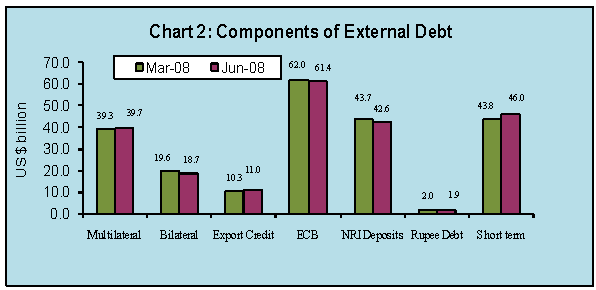As per the extant practice, India's external debt statistics for the quarters ending March and June are compiled and released by the Reserve Bank, while the external debt data for quarters ending September and December are compiled and released by the Ministry of Finance, Government of India. A detailed account of external debt as compiled in the standard format as at end-June 2008 in rupee and US dollar terms and revised data for earlier quarters are set out in Statement 1 and 2, respectively. 1. Stock of External Debt The external debt was placed at US $ 221.3 billion at the end of June 2008 as against US $ 220.7 billion at end-March 2008 recording an increase of US $ 0.6 billion or 0.3 per cent over the end-March 2008 level (Table 1 and Chart 1). 2. Valuation Changes The valuation effect reflecting the appreciation of the US dollar against other major international currencies and Indian rupee resulted in a decline in external debt by US $ 4.5 billion. This implies that excluding the valuation effects, the stock of external debt as at end-June 2008 increased by US $ 5.1 billion over the end-March 2008 level. 3. Components of External Debt The rise in external debt stock was essentially due to increase in short term debt which rose by US $ 2.2 billion during the quarter. The data on short term debt include both suppliers’ credit up to and above 180 days and FII investment in Government debt papers. The rise in short-term debt was mainly on account of rise in trade credit (in particular, trade credits above 180 days) attributed to the higher financing of imports during the quarter. Outstanding NRI deposits at US $ 42.6 billion as at end-June 2008 recorded a decline of US $ 1.1 billion over the level at end-March 2008. Despite inflows under NRI deposits during the quarter, the above decline in outstanding was mainly on account of valuation effect. The movements in the other components of external debt as at end June 2008 revealed that while there was an increase in multilateral debt and export credit, commercial borrowings, bilateral debt and rupee debt showed decline (Table 2 and Chart 2). Table 2: Variation in External Debt by Components
