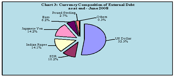 Notes: 1. Residual Maturity of NRI Deposits is estimated on the basis of the Survey conducted by the Reserve Bank on NRI deposits outstanding as on March 31, 2008. 2. The maturity pattern of NRO Deposits that was not available in the March 31, 2007 survey is now available in the March 31, 2008 survey. The maturity-wise break up of NRO deposits are thus, given. 3. FII investment in treasury bills and government dated securities are included under sovereign debt, while FII investment in corporate debt papers and other short-term debt instruments are included under Commercial Borrowings. 5. Currency Composition While the US dollar is generally used as the numeraire currency for computing external debt in order to facilitate international comparison, the currency composition of the external debt is essential to understand the currencies in which the debt is actually denominated and hence the extent of the economy’s vulnerability to solvency and liquidity risks. It also gives an idea of the extent of exposure of the economy to cross currency exchange rate movements. The currency composition of India’s external debt is generally disseminated in terms of major foreign currencies such as US dollars, Japanese yen, Euro, Pound Sterling, Special Drawing Rights (SDR) and the domestic currency i.e., Indian rupee. In this regard, it is stated that while calculating currency composition, the short term trade credit was generally taken to be in dollars as most of it was denominated in US dollars. However, recognising the growing volume of such credits in the recent years on the back of burgeoning imports and the increasing significance of currencies other than US dollar in the short term credit, the original currency breakup of the short term trade credit above 180 days was computed for end-March 2008 and end-June 2008. It was observed that about 70 per cent of the short term trade credit is denominated in US dollars, 14 per cent in yen, 13 per cent in Euro and the balance in other currencies. Looking at the overall external debt position, the US Dollar continues to remain the predominant currency accounting for 52.3 per cent of the total external debt stock as at the end of June 2008, followed by the Japanese yen (14.2 per cent), Indian rupee (14.1 per cent) and SDR (10.2 per cent) (Table 4 and Chart 3). The share of Euro has seen a rise from 4.0 per cent as at end-March 2007 to 6.2 per cent as at end-June 2008. Table 4: Currency Composition of External Debt