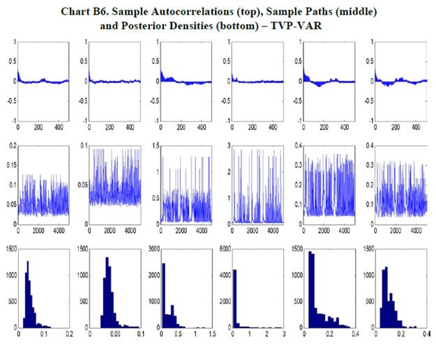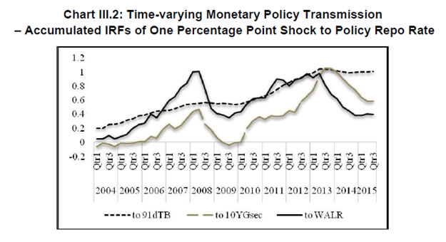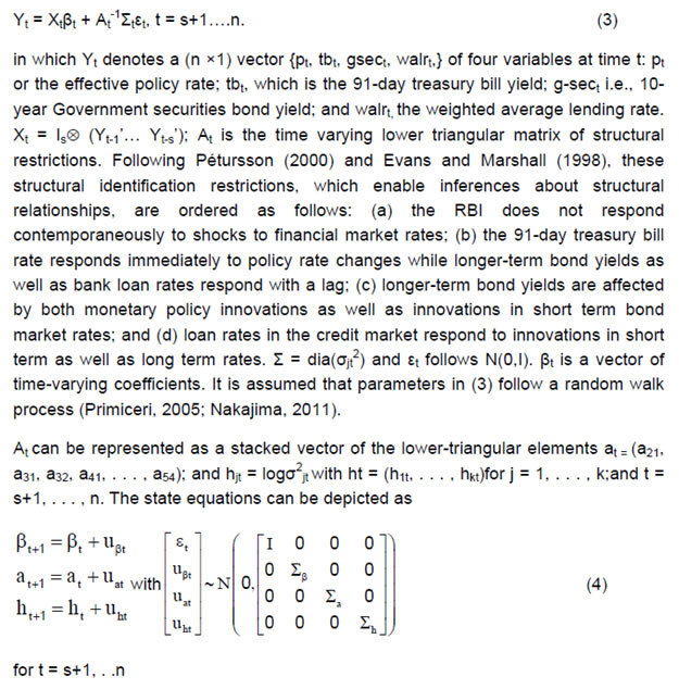 The Portmanteau (Q) test suggests that all innovations are white noise, validating the goodness of fit of the DFM. The indicator GFC is significantly correlated with all five spillover variables (Table 2), and especially with the VIX even when the other factors are taken into account. This result is consistent with the central tendency in the empirical literature (Nier et al., 2014). IGS tracks global financial conditions nicely, particularly the global financial crisis, the events relating to UMPs of the Fed, the sovereign debt crisis in Europe, the Chinese devaluation, the bund tantrum and the growing certainty around the Fed’s lift off (Chart III.1). It does not, however, adequately capture the impact of the 2013 taper tantrum. Capital flows to EMEs reversed between May 2013 to January 2014, but recovered across all major EMEs by Q1 of 2014. This short-lived episode was also suffused with domestic policy responses in a number of countries, some dramatic and unconventional, which might be blurring the clear indications reflected in US yield spreads (see section II). Section IV: Impact of Spillovers on Transmission Channels in India In this section, we set out to empirically evaluate the hypotheses proposed in the introductory section, armed with the lessons drawn from the literature and the specifics of the Indian experience. With the failure of large macroeconometric models in predicting turning points of business cycles the world over, especially after the stagflation experience following the oil price shocks of the 1970s, economists turned to the use of vector autoregression (VAR) models, drawing on seminal work to capture the dynamics in multiple time series (Sims, 1980). While the VAR model has the advantage of being free of a priori strong commitment to structural restrictions, the imposition of constancy in parameters as well as error variances may produce misleading results, especially when policy reaction functions and transmission are changing either due to structural breaks/regime shifts and/or the changing nature of shocks. This is particularly relevant in the context of the period of study of this paper which covers a catastrophe of global dimensions and aftershocks as well as significant structural transformation in the Indian economy. These developments can and have forced changes in monetary policy transmission due to: (a) unconventional policy responses despite a stated objective function, leading to excessive accommodation/contraction, depending on the compulsion faced by central banks; and (b) exogenous non-policy factors influencing transmission such as asset quality concerns in the banking system and associated risk aversion, competition from non-banks/shadow banks, administered interventions in setting interest rates and macro-prudential and regulatory interventions impacting flow and pricing of credit. Accordingly, the methodology adopted here draws upon a recently growing strand in the literature which employs VAR models involving time-varying parameters (TVP) with stochastic volatility in the tradition started by Primiceri (2005); other important contributions are Cogley et al., 2008; Nakajima et al., 2011, Nakajima, 2011; Mumtaz and Plassmann, 2013; and John, 2015. The TVP-VAR also allows for the checking of impulse responses at different points of time. Following Imam (2015), the estimated cumulative impulse responses from the TVP-VAR – representing the impact of monetary policy shocks - are regressed on the IGS developed in Section III, while controlling for relevant domestic factors, in order to assess the impact of spillovers on monetary policy transmission in India. The interpretation of exogeneity in this context relates to non-policy factors, even though financial market variables included in the TVP-VAR reflect both policy and non-policy influences. The TVP-VAR Framework The measurement equation is specified as ![]() in which Σβ, Σa and Σh are the variance and covariance structure for the innovations of the time-varying parameters, and are assumed to be diagonal (Nakajima, 2011). Furthermore, a TVP-VAR requires somewhat tighter priors for the βs since the state variables capture both gradual and sudden changes in the underlying economic structure, which can lead to over-identification (Primiceri, 2005; Cogley et al. 2010 and Nakajima, 2011). Accordingly, a tighter prior is set for Σβ and a relatively diffuse prior for Σa and Σh. While the hyper-parameters of Σβ are simulated from an inverse Wishart distribution, the elements of Σa and Σh are drawn from an inverse gamma distribution. The prior density of ω = (Σβ, Σa, Σh) is π(ω). Samples of the posterior distribution π(β, a, h, ω|y) are drawn using a Bayesian Markov Chain Monte Carlo (MCMC) method. Due to lack of sufficient data points in the sample, we choose a reasonably flat prior for the initial state from the standpoint that we have no information about the initial state a priori. To compute15 the posterior estimates, 5,000 samples are drawn. The convergence diagnostics of the estimation results of the TVP-VAR model are provided in Appendix B which shows that the sample paths are stable. After the initial draws, the sample autocorrelations are low. Quarterly data from Q1: 1996-97 to Q2:2015-16 are used16. Results17 The accumulated time varying IRFs18 of monetary policy innovations for tbt, gsect, walrt exhibit sustained improvement in transmission over time, interrupted by spillover induced disruptions which produce short-lived overreactions to global event shocks. Nevertheless, monetary policy transmission has always been positive around a rising trend (Chart III.2). Transmission to 91-day T-Bill is almost complete and instantaneous in more recent years. Long term rates, i.e., the 10-year G-sec yield and the weighted average lending rate showed significant loss of traction to domestic monetary policy shocks during the financial crisis (2008-09), but transmission improved