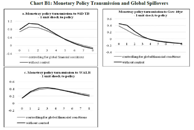 | RBI Working Paper Series No. 03 Abstract Do global spillovers clog transmission channels of monetary policy through domestic financial markets? Drawing on stylised facts and using a dynamic factor model to develop an indicator of global spillovers (IGS), a time-varying parameter vector autoregression (TVP-VAR) model results indicate that monetary policy transmission through the money market is complete even in the face of global spillovers. In the debt market, global spillovers affect transmission and can even produce overshooting and over-corrections, but domestic factors such as market microstructure have a stronger influence. In the credit market, spillovers have no statistically significant influence on transmission to lending rates. Asset quality of banks and financial deepening play a more important role. JEL Classification: C54; E52; E58 Key Words: Global Spillovers, Monetary Policy Transmission, Dynamic Factor Model, M-GARCH, Time-Varying Parameter VAR With the world’s largest economies setting divergent courses for monetary policy, will spillovers from this transatlantic schism imprison interest rates in emerging market economies (EMEs) like India that are reasonably well integrated into the global financial cycle? Will it be possible for these countries to conduct independent monetary policy as capital and asset prices are stirred up by the core financial centres? These questions form the theme of this paper. We ask them in the context of a rapidly proliferating strand in the empirical literature that is finding increasing evidence of significant spillovers effects not just for fixed income markets and longer-term interest rates (Obstfeld, 2015; Sobrun and Turner, 2015; Turner, 2014; Miyajima et al., 2014) but for short-term interest rates and policy rates as well (Hofman and Takats, 2015; Edwards, 2015; Takats and Vela, 2014; Gray, 2013). Furthermore, as this evidence accumulates, the channels of propagation are becoming clearer and as a consequence, more real and present for open EMEs – global economic and financial integration (Hofman and Takats,2015); investor arbitrage playing out through both EME allocations in globally mobile funds and foreign participation in local markets (Barroso, Kohlscheen and Lima, 2014); foreign currency denominated credit (He and McCauley, 2013); and increased sensitivity of EME policy makers to volatility in capital flows and exchange rates. While considerable heterogeneity is found in these effects across EMEs (Chen et al., 2015), the constraining effects of spillovers on domestic monetary policy is observed irrespective of the exchange rate regime (Rey, 2015). The persuasiveness of this strand notwithstanding, there is a contrarian view too – why wouldn’t there be one? In the long run we are all economists2 - that seems to be standing up to the tests of the episodes of volatility in 2015 relative to the ‘taper caper’3. It is argued that the concept of monetary policy independence needs to distinguish between the ability to set monetary policy independently and the willingness to do so, the latter implying the extent to which external developments enter policy reaction functions of EME central banks and the coefficients attached to them. The effects of spillovers or contagion when appropriately measured seem to be less severe for EMEs than generally assumed or observed in financial phenomena such as co-movements in interest rates across borders (Disyatat and Rungcharoenkitkul, 2015). First, in the taper caper and its aftermath, several EMEs allowed exchange rate adjustments, some even large and apparently disruptive, but this enabled them to set domestic interest rates to domestic conditions. The exchange rate change was a measure of the importance of external developments in their reaction functions and their willingness to accommodate them rather than a loss of monetary policy independence. By the same logic, several EMEs are regarded as engaged in pursuing exchange rates that reflect domestic goals – competitive depreciations. Both interest rates and exchange rates can be regarded as instruments that serve domestic objectives. Secondly, some EMEs with large reserves actively intervened to stem turmoil in their foreign exchange markets and by all counts succeeded, effectively preventing the trilemma from breaking down to a dilemma a la (Rey, 2015) and setting in motion what has been termed as quantitative tightening (QT) that supported domestic conditions. Also, many EMEs continue to retain both macro-prudential and administrative policies that can influence capital flows in both directions, and this instrument is acknowledged to secure monetary policy autonomy. Thirdly, several EMEs including India have repaired and strengthened macroeconomic fundamentals and policies. As events of 2015 relative to the taper caper showed, these actions buffered their economies considerably, contrary to the view that in the face of spillovers, fundamentals do not matter (Eichengreen and Gupta, 2013)4. This view itself has been questioned by evidence of investors differentiating among EMEs based on fundamentals, and especially in favour of deeper markets and tighter macro-prudential policies (Mishra et al., 2014a). Moreover, differentiation was found to have set in early and persisted for some time (Ahmed et al., 2014). In fact, this has led several central banks to urge the US Fed to stop stoking speculation and to ‘just get on with it’ in normalising US monetary policy (Weidman, 2015; Singh, 2015; Shanmugaratnam, 2015; Rajan, 2015). This paper is an empirical exploration of these two sets of issues in the Indian context. The rest of the paper is organised into five sections. The next section presents stylised evidences on channels of contagion and their impact on financial markets in India which transmit monetary policy. Section III develops a measure of global spillover. Section IV presents and discusses empirical results. Section V conc