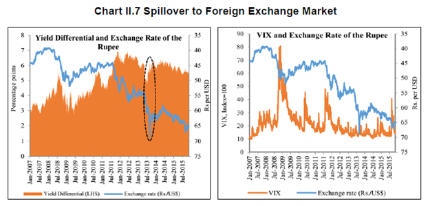 To summarise, the empirical results indicate that monetary policy transmission through the money market – the first leg of transmission – has improved substantially and is found to be almost complete even in the face of global spillovers. In the debt market, however, global spillovers affect transmission of monetary policy to yields and can even produce overshooting and over-corrections, but domestic factors such as market microstructure have a stronger influence. The latter may be influential in rendering the reactions to global perturbations short-lived and in ensuring mean reversions to normalcy. In the credit market, lending rates reflect low and incomplete transmission of monetary policy even absent global spillovers. Spillovers have no significant influence either; asset quality and financial deepening play the more important role in determining policy transmission. These findings do not, however, negate the overwhelming effects that global spillovers can produce on global output and inflation gaps and, in turn, on the domestic gaps. To that extent, spillovers do pose challenges to the successful conduct of monetary policy in pursuit of domestic goals. V. Conclusions The mainstream view that global spillovers overwhelm monetary policy independence is being questioned by specific country experiences. The focus of this ongoing debate is on the efficacy of monetary policy transmission, since the effects of UMPs on goal variables is still an unsettled issue. Here global real business cycles may be at work rather than financial forces. The arena shifts to the spectrum of financial markets which provide the transmission lines. In India, money markets are largely sheltered from spillovers, so too are credit markets, highlighting the shielding influence of the RBI’s active liquidity management, besides country specific factors that impart a distinct home bias. In bond, forex and equity markets in which foreign presence provides a conduit for contagion, capital flows management buffered by foreign exchange reserves will be tested for endurance in the period ahead by the exhaust fumes of Fed lift-off and the idling engines of monetary super accommodation. VAR and MGARCH estimates provide statistically significant evidence of spillovers transitorily affecting domestic financial markets. Extracting common elements in these spillovers through a dynamic factor model, a composite indicator of global spillovers (IGS) damps time varying monetary policy transmission in the domestic bond market. The credit market is impervious. In the money market, time varying transmission actually improves in times of global spillovers. Thus, there is no statistically strong evidence of domestic monetary policy losing traction. Monetary policy does respond directly to volatility-driven stress in domestic financial market conditions, but this needs to be regarded as a policy choice with the ultimate objective of meeting domestic goals, rather than a loss of monetary policy independence. Global shocks in a globalised economy are unavoidable, but stabilising the domestic economy irrespective of the nature and sources of shocks to domestic transmission channels remains a key task for domestic monetary policy. @ The views expressed in this paper are attributable to the authors and not to the institution to which they belong. The authors are grateful to B K Bhoi, Muneesh Kapur, Jeevan K Khundrakpam and Rajesh Kavediya for their valuable comments which enriched the contents of this paper. All other usual disclaimers apply. 2 In the tradition of Keynes’ famous remark in A Tract on Monetary Reform (1929) which went on to state that “Economists set themselves too easy, too useless a task, if in tempestuous seasons they can only tell us, that when the storm is long past, the ocean is flat again.” 3 A term recently coined by Bernanke in his autobiography. 4 In fact, India exited the ‘fragile five’ grouping and escaped the more recent ‘troubled ten’ epithet. 5 The Indian experience suggests that even when spillovers impact the domestic bond market, monetary policy actions and other domestic factors regain their influence on the G-sec market fairly quickly. In 2013-14, the 10-year yield declined to a low of 7.12 per cent on May 24, 2013 largely on moderation in inflation. Following the taper talk induced sell-off by FIIs in the bond market and the subsequent exceptional monetary and liquidity tightening measures announced by the Reserve Bank, yields rose and peaked at 9.27 per cent on August 19, 2013. Open market operations softened yields in August 2013. Subsequently, as the taper effects abated and monetary policy normalised, the step-up in government borrowings and antiinflationary stance of monetary policy took hold and pushed yields to 8.84 per cent by the end of the year (RBI, 2014). 6 In Mexico, Turkey and South Africa, the shares of foreign investors in total domestic public debt have increased since 200708 from 9 per cent to 37 per cent, 11 per cent to 30 per cent, and 25 per cent to 38 per cent, respectively (Atiyas et al., 2013). 7 During 2009-14, sovereign and corporate cumulatively issued US$ 1.5 trillion in external bonds, up from US$ 520 billion in 2002-07. Since 2009, global bonds funds and equities funds allocations to EMDEs, have increased by 375 per cent and 70 per cent, respectively, while foreign participation in local bond markets has increased up to 26 per cent (Freyen et al., 2015). 8 In India, long-term and short-term borrowings (from banks, non-banking financial entities and markets) account for about 32.7 per cent of total funding of non-government non-financial private limited companies, of which 17.3 per cent (or close to 52 per cent of total borrowings) is from banks (RBI, 2015). 38.5 per cent of funding comes from internal sources. 9 Two broad weighted sum approaches are commonly used to assimilate information embodied in a range of variables which entail common elements as also