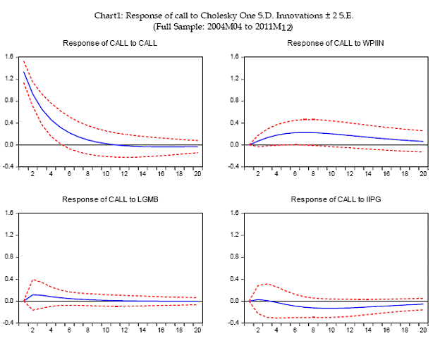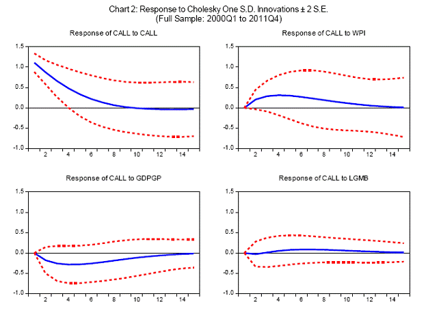 5.2 Results The results of unit root tests, reported in Appendix Table 1, exhibits that null hypothesis of unit root is rejected in case of all variables at level. After ascertaining that all variables are I(0), i.e., stationary (mean reverting), we find out the lag structure using different inflation criterions before estimating VAR structure. We use three information criterions, viz., Akaike information criterion (AIC), Schwarz information criterion (SIC), and Hannan-Quinn information criterion (HQ). It is found that AIC supports lag order at two, while other two SC and HQ support lag order at one (Appendix Table 2). Based on the majority rule, we take lag order of one while estimating VAR model for the aforementioned monetary policy reaction function. The main objective of estimating the monetary policy reaction function in a VAR framework is to ascertain whether the level of government market borrowing influence the monetary policy decision about policy rate change. More specifically, we try to find out whether monetary policy decides not to increase its policy rate in order to keep cost of government borrowing low and in turn, compromise with the objective of containing inflation/inflation expectations. The forecast error variance decomposition of the CALL, which is the operating target for the monetary policy in India, with respect to other explanatory variables have been estimated in the VAR model. The results furnished in Table 1 below show that largest forecast error variation in CALL is explained by its lagged value, followed by P. The results further show that LGMB explains an insignificant portion of forecast error variation (i.e., about 1.7 per cent) in CALL. The contribution of the lagged value of CALL in its forecast error variation decreases from about 99 per cent in the 2nd period to about 80 per cent in the 15th period, while the contribution of P increases from about 0.3 per cent in the 2nd period to about 14 per cent in the 15th period. OG’s contribution in forecast error variation of CALL increases from 0 per cent to about 5 per cent during this period. Furthermore, the impulse response of CALL to one Standard Deviation (SD) innovation (+/- 2.5) in LGMB is insignificant (Chart 1); in fact, the response of CALL is meagre and that also dissipates completely by the 10th period. It is imperative to mention here that as per the conflict of interest argument, the CALL should either not respond or respond negatively to the positive innovation in LGMB to reduce the cost of borrowing, while response of the CALL has been found other way around but that too insignificant. We also estimate the VAR Granger Causality to find out whether LGMB causes the CALL. The results in Table 2 reject the null hypothesis of LGMB granger causing CALL, which means that LGMB has not influenced the CALL. As per the results, only P is found to be Granger causing CALL at 10 per cent level of significance. The results of all tests in VAR, i.e., variance decomposition, impulse response function, and Granger causality demonstrate that the response of the CALL to the LGMB is not statistically significant. Alternative Estimation The above results show that response of CALL is not only found statistically insignificant to LGMB but also to OG. The response of CALL to OG is not consistent with recent empirical studies on monetary policy reaction function, which find that monetary policy responds to both inflation and output gap. Therefore, to verify our above results, we estimate the augmented monetary policy reaction function in VAR framework with quarterly data on call rate (CALL), inflation (P), output gap (OG), and log of Govt market borrowings (LGMB). We use GDP growth gap i.e., trend growth minus actual growth for OG in estimation, instead of industrial output gap which was used in earlier estimation to represent OG in the absence of monthly GDP data. Data has been used from 2000:Q1 to 2011:Q4. Although all the variables are found stationary (Appendix Table 3), CALL is found weak stationary as null hypothesis of unit root is rejected at 10 per cent level of significance. Further, the lag for VAR estimation has been selected at one based on SIC (Appendix Table 4). The results of forecast error variance decomposition of the CALL with respect to its own lagged values and other explanatory variables, furnished in Table 3 below, reveal that largest variation in CALL is explained by its lagged value, followed by P and OG. The contribution of LGMB to the forecast error variation of CALL is found negligible. The contribution of P and OG in the forecast error variance of Call increases from each about 2 per cent in period 1 to about 13 per cent and 12 per cent, respectively by 10th period. At the same time, LGMB is found explaining insignificant portion of variation in CALL (i.e., about 1 per cent). The results of forecast error variance decomposition in alternative estimation are found consistent with the same in earlier estimation with respect to LGMB explaining insignificant variance in CALL, while the contribution of OG to variance of CALL is found significant contrary to the results of earlier estimation where the contribution of the same is insignificant. The impulse response of CALL to one Standard Deviation innovation (+/- 2.5) in LGMB is insignificant and that also dissipates completely by the 10th period (Chart 2). The results of VAR Granger Causality shows that the null hypothesis of LGMB granger causing CALL is rejected, which means that LGMB has no statistically significant influence on the CALL (Table 4). As per the results, only P is found to be Granger causing CALL at 10 per cent level of significance, like the results of VAR Granger Causality in earlier estimation. In the alternative estimation also, the results of all tests in VAR, i.e., variance decomposition, impulse response function, and Granger causality are found to demonstrate that the response of the CALL to the LGMB is not statistic