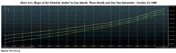 4.15 Forward premia in Indian foreign exchange markets have generally been lower than the rate dictated by the interest rate differential (Chart 4.9). On some occasions, as in March and October 2008, the forward premia diverged further (and became negative on some days) in the wake of acute, though temporary, cash US dollar shortages. 4.16 The weakness in the Indian rupee against the US dollar in 2008 was also accompanied by heightened exchange rate volatility. The volatility of the US$/INR was, however, less pronounced than that of currencies of advanced countries, as was the case with the currencies of major EMEs (Chart 4.10). 4.17 The domestic foreign exchange market also exhibited expectations of appreciation of the US dollar against the Indian rupee, especially in the wake of the failure of Lehman Brothers. This was reflected in the shapes of volatility smiles in October 2008 (Chart 4.11) which showed the extremely high demand for US dollar calls as compared to the US dollar puts at various strike prices, resulting in a skewed structure. Moreover, the preference was for very deep in-the-money calls.