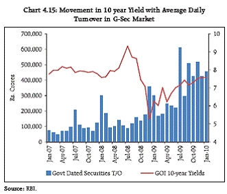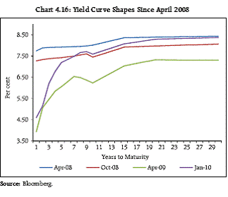 Government Bond Markets 4.23 In line with global trends of increased government spending in response to the economic slowdown, the Government announced stimulus packages during 2008-09 which resulted in net market borrowing through dated securities to nearly double from that of 2007-08. The net market borrowing for the year 2009-10 was about Rs.4,00,000 crores, 80 per cent of which was completed by late October 2009. 4.24 Concerns about high fiscal deficit (particularly when inflationary expectations are not benign) have put upward pressure on government bond yields. Higher bond yields have the potential to raise the cost of borrowings for the corporate sector and this constitutes a risk for economic recovery. However, the rise in yields moderated as the Reserve Bank announced its plans for open market operations to purchase government securities upto Rs.80,000 crores for the first half of 2009-10 and to issue securities of shorter maturities (Chart 4.14). In addition, Market Stabilisation Scheme (MSS) buyback auctions and open market purchases were synchronised with the Government's normal market borrowings and de-sequestering of MSS balances. By appropriately releasing liquidity to the financial system, the Reserve Bank ensured a relatively smooth conduct of the Government's market borrowing programme in 2009-10. 4.25 Turnover in the government bond markets has been a function of yield movements and the evolving fiscal position (Chart 4.15). The trading is generally high during times of softening yields. On the other hand, the market tended to become shallower and trading lacklustre during periods of rising yields, indicating the pre-dominance of long only investors in the market. The proportion of government securities in the trading book of financial institutions like banks that dominate trading is low. The reason for this is that much of the investment by banks in government securities is part of the mandated SLR requirement and is held to maturity to avoid the markto- market risk. 4.26 The yield curve shifted upwards between April 2008 and September 2008 due to general firming up of interest rates and the increase in policy rates viz. raising of repo rate from 7.75 per cent to 9 per cent. Thereafter,following the easing of liquidity and the sharp reductions in the policy rates (repo rate was brought down to 4.75 per cent by April 2009), the curve steepened significantly with the long term rates remaining somewhat sticky. The yield curve has since started to shift higher with the curve steepening further in the short end on the back of inflation concerns and higher supply of government bonds (Chart 4.16).