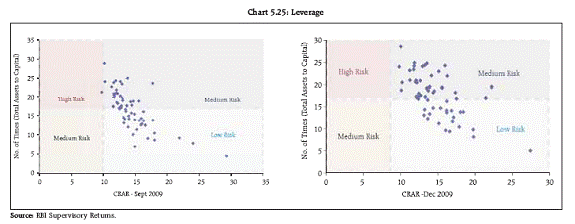 5.40 Amongst the BRIC countries, the average CRAR of Indian banks remained below the average CRAR of Brazilian and Russian banks (Chart 5.24). Leverage 5.41 High leverage in the financial system has been considered as one of the major factors leading to the recent global turmoil. The leverage (ratio of assets and off balance sheet items (credit conversion factors) to capital) of the Indian banking system which stood at 16.3 times at end-September 2009, decreased marginally to 16.1 as at end-December 2009. Pertinent here is the fact that scheduled commercial banks in India are stipulated to hold a minimum of 25 per cent of their net demand and time liabilities in approved liquid securities. The system-wide leverage ratio, net of such approved securities, was considerably lower at 13.0 as at end- September 2009 and 12.9 as at end-December 2009. 5.42 An analysis of the CRAR and leverage of the top 60 banks in India (in terms of asset size) indicate that most banks were closely concentrated in the range of CRAR of 12-16 per cent and leverage between 13-20 times respectively as at end-September 2009 (Chart 5.25). There was only one outlier bank with a relatively high leverage and low CRAR which accounted for just 0.2 per cent of total bank assets and hence was not considered to be a source of significant risk /concern to stability. As at end- December 2009, no bank was in the high risk category of low CRAR and high leverage.