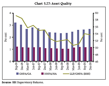 4.50 Interest rate and growth rate differential between India and the developed markets has the potential to cause large capital flows into India. Capital flows have in fact already increased with rise in risk appetite in view of the early recovery in India, sharp improvement in asset prices and early exit initiated by India out of extraordinarily accommodative monetary policies compared to other developed and even some emerging markets. Large capital flows beyond the absorptive capacity of the economy exert pressure on the exchange rate and have implications for financial stability. They also increase the cost of sterilisation causing the fiscal burden to grow. 4.51 Corporate hedging behaviour is influenced by liquidity and risk appetites. If the former is low and latter high, it causes disincentives to hedge economic risks. Increases in un-hedged exposures by corporates during periods of volatility raises systemic concerns. _____________________ 1 Itraxx Crossover is the Markit iTraxx Europe Crossover Index and is composed of around 40 entities. The graphs use the series with effective dates in September 2008 and March, 2009 and maturity dates in 2014. Itraxx Europe is the Markit Itraxx Europe Index composed of 125 investment grade entities from various sectors like automobiles, energy, financials etc. The series used are the ones maturing in 2014. CDX Investment Grade is the Markit CDX North America Investment Grade index composed of 125 investment grade entities from various sectors and the two series used mature in 2014. CDX Crossover is the Markit CDX North America Crossover Index composed of 35 entities each having an eligible rating as defined in the index rules. The two series used mature in 2013. 2 The FOMC meeting held in January and later in March 2010 did have one member, Thomas Hoenig, dissenting the decision to retain the language seeking low rates for an extended period. 3 DXY represents the value of the US dollar against six developed market currencies. The highest weight is for the Euro at 57.6 per cent. The weights of the other currencies are as follows: Japanese yen: 13.6 per cent, Pound sterling: 11.9 per cent, Canadian dollar: 9.1 per cent, Swedish krona: 4.2 per cent and Swiss franc: 3.6 per cent. 4 ADXY is the Bloomberg-JP Morgan Asia Dollar index and is weighted in terms of trade and liquidity of Asian currencies. Chinese yuan has the highest weight in the index at 32.6 per cent. Weights of the other currencies are as follows : Hong Kong dollar : 11.8 per cent, Singapore dollar : 11.2 per cent, Korean won : 16.1 per cent and Indian rupee : 6.1 per cent, Indonesian rupiah : 2.9 per cent, Malaysian ringgit 5.4 per cent, Philippine peso 1.9 per cent, Taiwanese dollar : 7.6 per cent and Thai baht : 4.4 per cent. 5 A volatility smile is a plot of implied volatility against strike prices for an underlying. The shape of such a plot is normally like that of a smile and therefore, the name. This is a typical shape in option markets other than for equities. It has been observed that deep out-of-the-money and deep in-the-money strike prices have higher implied volatility in the market when compared to the estimates using normal probability distribution. While at-the-money options have implied volatilities that are closer to estimates using a normal probability distribution. The implication of higher implied probability is that the market estimates deep out-of-the-money and deep in-the-money strike prices to have a higher probability of occurrence than the ones implied by normal curve distributions. A skewed shape as in Chart 4.17 suggests a great demand for buying calls and selling puts of US dollars against the Rupee. 6 The data pertains only to the exposures/hedges of above US$ 25 million. The amount of unhedged exposure has been determined without taking in to account the natural hedges available to domestic entities. The data also does not cover exposures of FIIs and other non-resident entities. These hedges also include forwards/options booked under the past performance facility, for which underlying may not be available as yet. The assessment of the portion of unhedged exposures on the buy side & sell side separately is not possible currently. Chapter V The key feature of the Indian financial system is its heterogeneity. It derives its strength from its soundness and resilience, which have ensured that the sector was not impacted significantly even during the most acute period of the global financial turmoil. Commercial banks, the dominant segment of the financial sector, have remained healthy, though incipient signs of deterioration in asset quality could cause some concern going forward. This has manifested itself in an improved rating outlook for the entities in the sector. Significant measures have been taken in the co-operative banking sector which is recording an improvement in its performance parameters, though concerns remain. The NBFC sector has been well regulated in general and the NBFCs-ND-SI, in particular, are under close monitoring. However, some strengthening of the supervisory regime for the NBFCs- ND-SI will be needed for a more robust assessment of the underlying risks. Overall the performance of the banks and non-banks within the regulatory ambit of the Reserve Bank through this troubled period has been found to be satisfactory. Financial Institutions Structure 5.2 Banks have traditionally been the most important financial intermediaries in India, accounting for approximately 70 per cent of total assets in 2009 (Chart 5.1). The commercial banks dominate the sector, comprising more than three-fifths of financial system assets. The financial intermediation by banks in India has played a central role in supporting the growth process, by mobilising savings.