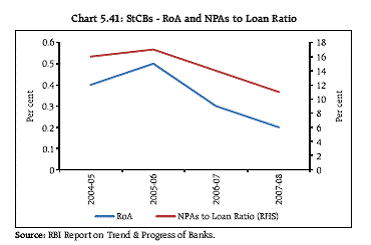 5.78 While the NPA ratios have been declining over time for SUCBs, the level of gross NPA ratio still remains high. (Chart 5.37). The high loan loss provisions (Chart 5.38) has resulted in a low net NPA ratio. Though this has the potential of impacting profits in the sector adversely, presently, the RoA has maintained a positive trend. 5.79 One source of comfort is that the sector is well capitalised. The reasonably high level of CRAR (12.8 per cent at end March 2009) is supplemented with a declining leverage ratio (Chart 5.39). Rural Cooperative Sector 5.80 The rural co-operative sector which constitutes 4.7 per cent of the financial system assets can be bifurcated into short-term and long-term. The shortterm structure is three tier with the State Co-operative Banks (StCBs) at the apex, followed by the District Central Cooperative Banks (DCCBs) at the intermediate level and the Primary Agricultural Credit Societies (PACS) at the village level. The long-term cooperative structure on the other hand is two tiered with the State Co-operative Agriculture and Rural Development Banks (SCARDBs) at the apex level followed by the Primary Co-operative Agriculture and Rural Development Banks (PCARDBs) at the district or block level. These institutions were conceived with the objective of meeting long-term credit in agriculture. The Reserve Bank is mandated to regulate the StCBs and DCCBs and their supervision is vested with NABARD. 5.81 This sector has a critical role in improving financial inclusion and catering to vital sectors, like agriculture and allied economic activities. However, it raises a number of challenges such as dual regulatory control, weak management information systems, poor internal controls, a low resource base, poor asset quality, low levels of profit and high accumulated losses. The sector is generally impaired financially and institutionally. Some of the banks have substantial deposit base (there are 12 StCBs having deposit base of more than Rs. 1,000 crore each as on March 2008 - Data NAFSCOB). The system level data for the rural co-operative institutions is available with a time-lag and this hampers an up-to-date analysis (Chart 5.40, Chart 5.41 and Chart 5.42).