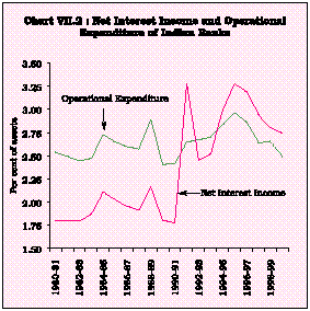 7.16 During the 1980s, the cost of intermediation, i.e., the operating expenditure as a proportion of total assets, in the Indian banking system generally hovered between 2.5 per cent and 2.8 per cent (Chart VII.2). The spread or net interest income as a proportion of assets varied between 1.8 per cent and 2.3 per cent. Both operating expenditure and net interest income followed an inverted U curve in the 1990s, peaking at 2.9 per cent and 3.3 per cent, respectively, during 1995-96. While the cost of intermediation during 1999-2000 worked out to 2.5 per cent, net interest income amounted to 2.7 per cent.