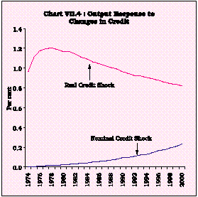 7.32 Given the relationships obtained through the regression equations between investment and capital stock on the one hand, and capital stock and growth, on the other, the extent of and the time path over which change in credit could influence growth has been simulated by giving one percentage point shock to the alternative credit variables (Chart VII.4). The output response appears to be relatively stronger and persistent when credit increases in real terms.