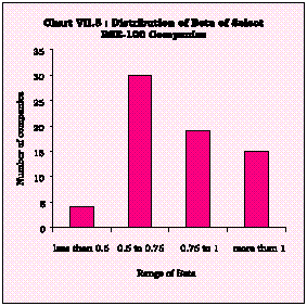 7.39 The beta (b) of a stock estimates riskiness relative to the market. The b values could also be used to ascertain whether it is economy-wide or company-specific factors, which play an important role in explaining the stock returns. Of the 68 stocks, b values only in respect of 18 scrips were found to be around unity (with variations of +/- 10 per cent) (Chart VII.5). That is, risk-return perceptions are influenced by the company-specific factors as well as by the market-wide factors.