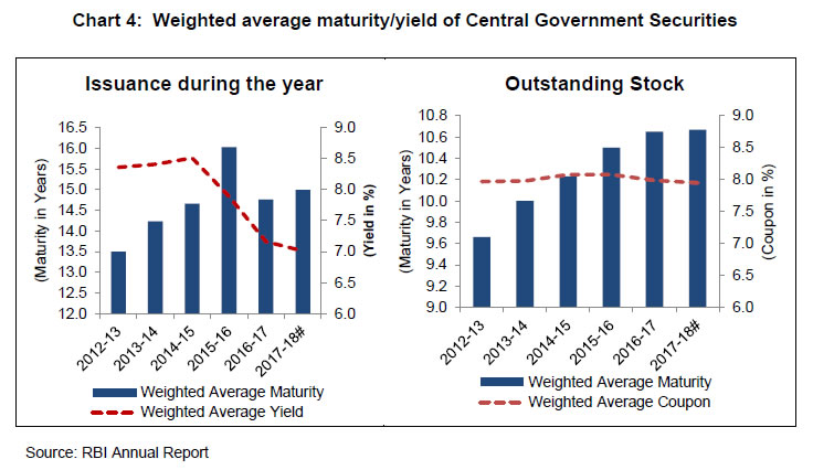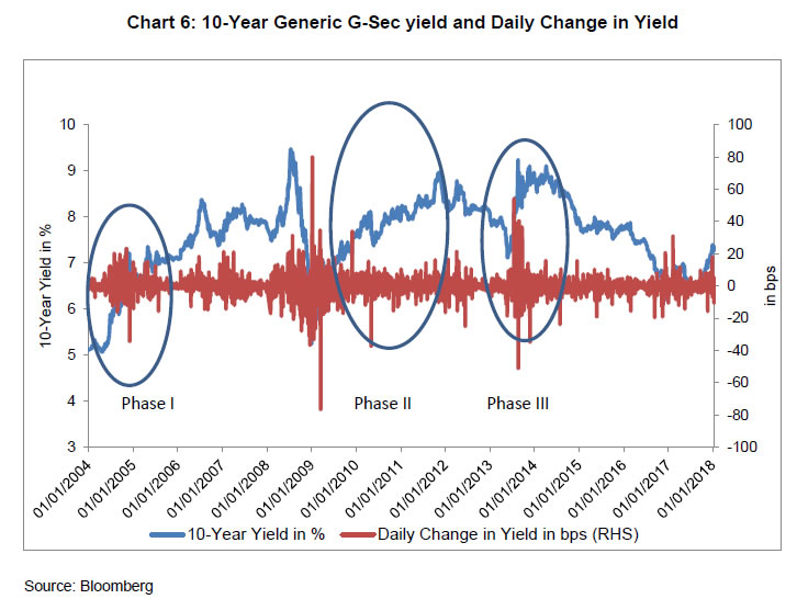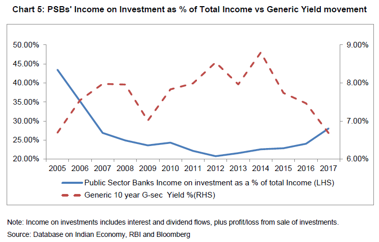 For example, a portfolio of size 1 trillion with 10 years of duration, falls in value by 10 billion upon a 0.1% or 10 basis points (bps) rise in the 10-year G-Sec benchmark yield. Let us consider each of these factors, in turn, in the present and historical Indian context. Size of the Portfolio2 The share of commercial banks in outstanding G-Secs is around 40% (June 2017). Investment of Scheduled Commercial Banks (SCBs) in G-Secs as a percentage of their total investment was around 82% for FY 2016-17. The corresponding figure for Public Sector Banks (PSBs) for FY 2016-17 is slightly higher at 84%. This exposure has noticeably increased since 2014 (Chart 3a). In spite of the relative stability of the consolidated Debt/GDP ratio of the government, the investor base for G-Secs in India is primarily limited to domestic institutions. As a result, there are often situations of oversupply of government bonds relative to demand. This appears to be the case especially for Indian banks going by their high excess SLR holdings. One reason banks end up holding high levels of government debt is because in the Indian milieu, they end up as residual holders in case of relative oversupply, as the appetite of other major institutional investor categories like insurance and pension funds is limited by their investment mandates. Another important reason in recent times has been that excess liquidity in the banking system did not end up being parked at the Reserve Bank’s liquidity mop-up operations which would have kept duration risk minimal. Instead, the surplus liquidity found its way into G-Secs as domestic sovereign debt is the most attractive investment for capital-starved banks looking for short-term gains even if at the expense of greater duration (as I explained earlier, this was the case also in the European context). As a result, the size of banking sector’s balance-sheet exposure to G-Secs, and hence, its interest rate risk, is high in an absolute sense, and is relatively elevated, when measured in proportion to total assets, for public sector banks relative to private banks (Chart 3b). Duration of investment book and the maturity structure of G-Secs The high interest rate exposure of banks from their G-Sec portfolios is attributable to not only the size of their holdings, but also to the increasing maturity of primary issuance. The weighted average maturity of the stock of Government securities has increased steadily from 9.66 yrs in 2012-13 to 10.67 yrs in 2017-18 (Chart 4). The average tenor of annual issuance during the last five years has been high at around 15 years. What are implications of this changing maturity structure of G-Secs for the duration of bank investment portfolios? The investment portfolio of banks is classified under three categories, viz., 'Held to Maturity (HTM)', 'Available for Sale (AFS)' and 'Held for Trading (HFT)'. Banks normally hold securities acquired by them with the intention to hold them up to maturity under HTM category. Only debt securities are permitted to be held under HTM with a few exceptions, e.g., equity held in subsidiaries. Holding securities under HTM provides cushion for banks from valuation changes. However, holding in HTM book is subjected to a ceiling. AFS and HFT categories together form the trading book of banks. Banks are permitted to decide on the extent of holdings under AFS and HFT based on their trading strategy, risk appetite, capital position, etc. Securities held under both these books are required to be marked to market. HFT book is required to be marked to market on a more frequent basis than AFS. Valuation frequency of investment is typically a determinant in the composition of investment book of banks. Correspondingly, shares of HTM, AFS and HFT are 55.4%, 42.5% and 2.1%, respectively, as on September 2017 (Financial Stability Report, RBI, December 2017). The average modified duration of the AFS book of banks is currently around 2.9 years. The comparable figure for PSBs is higher at 3.5 years and for PvtSBs is at 2.0 years. With relatively high duration and concentration of G-Secs in investment portfolio, bank earnings and capital remain exposed to adverse yield moves, especially as the share of investment income has been on the rise in the last five years. Chart 5 captures this fact succinctly that investment income of banks is highly sensitive to G-Sec yields – yields had by and large fallen in recent years, and consequently, investment income went up. In turn, and given the muted credit growth over this period, especially at PSBs, investment income has again started playing a rather important role in determining bank earnings. Movement in yields - Phases of sustained yield rise G-Sec yields in India have undergone episodic phases of sustained rise of close to 200 bps at regular intervals. Chart 6 identifies three major phases for the 10-year benchmark yield over the past 15 years: