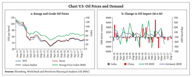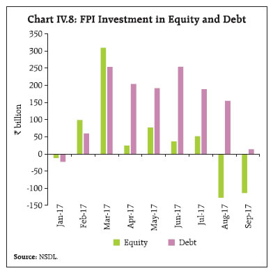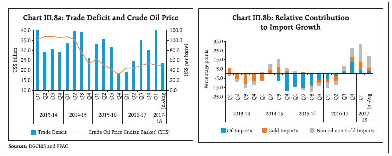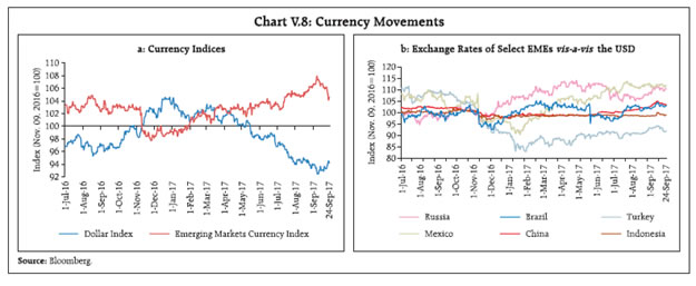 The exchange rate of the Indian rupee has exhibited two-way movements vis-à-vis the US dollar during the first half of 2017-18. Going forward, the normalisation of monetary policy in the US (and possibly other central banks in AEs) and protectionist policies of major AEs and EMEs could lead to some volatility in the foreign exchange market and downward pressures on the exchange rate. A depreciation of the Indian rupee by around 5 per cent relative to the baseline could raise inflation by around 20 bps in 2017-18, while producing some positive impact on net exports and growth. On the other hand, in view of the robust growth prospects of the Indian economy in a cross-country perspective and the various initiatives to attract foreign direct investment, India is likely to remain an attractive destination for foreign investors and this could lead to an appreciation of the domestic currency. An appreciation of the Indian rupee by 5 per cent could soften inflation by around 20 bps but also deliver a negative impact of 10-15 bps on real GVA growth.