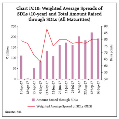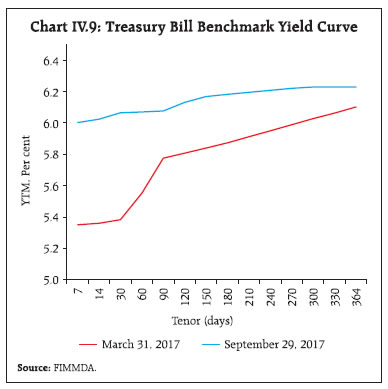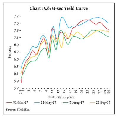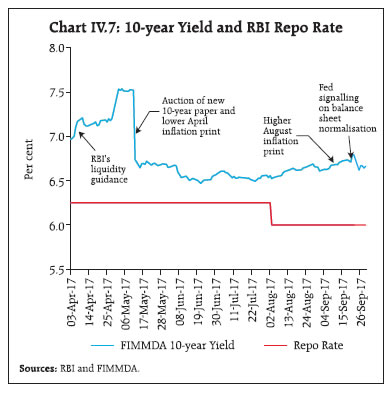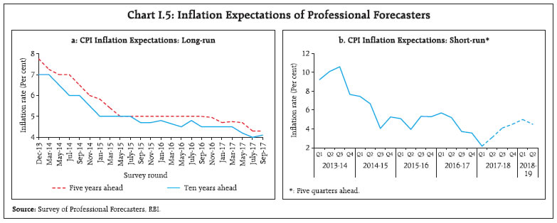 Professional forecasters surveyed by the Reserve Bank in September 2017 expected CPI inflation to pick up to 4.5 per cent by Q4:2017-18, with the ebbing away of favourable base effects (Chart I.5)4. Their medium-term inflation expectations (5 years ahead) remained unchanged at 4.3 per cent, while the longer-term inflation expectations (10 years ahead) rose by 10 bps to 4.1 per cent.