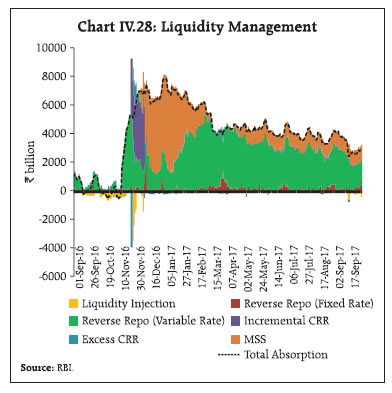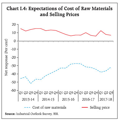 Manufacturing firms polled in the September 2017 round of the Reserve Bank’s industrial outlook survey expected some softening in inputs costs a quarter ahead, both for raw materials and staff costs.3 The respondents also expected some moderation in selling prices, indicating weak pricing power (Chart I.4). In the Nikkei’s purchasing managers’ survey for September 2017, firms in the manufacturing sector faced input and output price pressures from higher tax rates and prices of steel and petroleum products; firms in the services sector in August 2017 faced price pressures from higher tax rates.