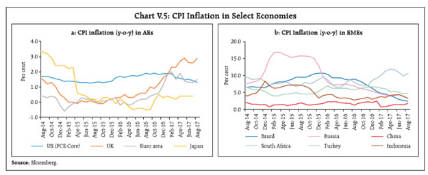 Consumer price inflation fell sharply in the first quarter of 2017-18, driven down by a collapse in food inflation and a marked moderation in inflation in other components. The trajectory reversed in July and August as vegetable prices spiked and prices of other goods and services firmed up. Input costs tracked movements in international commodity prices, while wage growth in the organised and rural sectors firmed up modestly.
