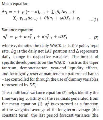 3 Historical decompositions are used to estimate the individual contribution of each shock to movements in inflation over the sample period based on a Vector Auto Regression (VAR) with the following variables (represented as the vector Yt): annual growth rate in crude oil prices in Indian rupees, inflation, output gap measured by using the Hodrick–Prescott filter, annual growth rate of rural wages and the policy repo rate. The VAR can be written in companion form as: Yt =c + A Yt-1 + et; where et represents a vector of shocks [oil price shock; supply shock (inflation shock); output gap shock; wage shock; and policy shock]. Using Wold decomposition, Yt can be represented as a function of deterministic trend and sum of all the shocks et. This formulation allows to decompose the deviation of inflation from the deterministic trend as the sum of contributions from various shocks.