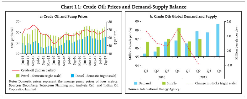 First, the spatial and temporal distribution of the south-west monsoon has been uneven and deficient in some parts of the country, which is expected to lead to a decline in kharif output. Second, global crude oil prices have moved in a relatively wide range of US$ 44- 57 per barrel over the past six months. Futures prices juxtaposed with the outlook for global production, demand and inventories suggest that crude prices could be around US$ 55 per barrel during the second half of 2017-18 (Chart I.1). Third, the exchange rate of the rupee has exhibited two-way movements vis-à-vis the US dollar since March 2017 with an appreciating bias until July 2017, given the strength of capital inflows and the weakening of the US dollar vis-à-vis other major currencies. The rupee has, however, reversed some recent gains with the announcement of the unwinding of QE by the Fed.