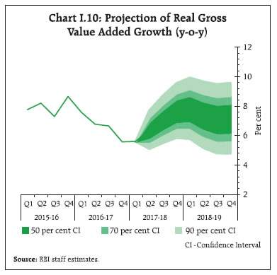 Taking into account the outturn in the first half, the baseline assumptions, survey indicators and model forecasts, real GVA growth is projected at 6.7 per cent for 2017-18 – 6.4 per cent in Q2, 7.1 per cent in Q3 and 7.7 per cent in Q4 – with risks evenly balanced around this baseline path. For 2018-19, structural model estimates indicate that real GVA may grow by 7.4 per cent, assuming a normal monsoon, fiscal consolidation in line with the announced trajectory, and no major exogenous/policy shocks (Chart I.10).