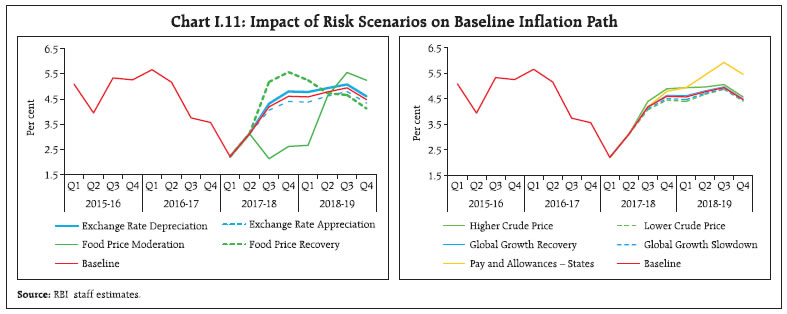 There are upside as well as downside risks to these baseline forecasts. The major upside risks emanate from the expected increases in salaries and allowances by State Governments; the possible fiscal slippages due to farm loan waivers by some States and potential stimulus measures by the Central Government (Box I.1); short-term uncertainty around the GST impact; and the expected decline in the production of kharif foodgrains. In terms of downside risks, adequate food stocks and effective supply management measures by the government could keep food inflation lower than expected and pull down headline inflation below the baseline.
