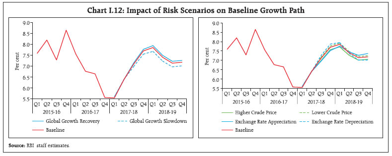In the baseline forecasts, the crude oil (Indian basket) price is assumed to average around US$ 55 per barrel in the second half of 2017-18 on the expectation that the global oil supply would be sufficient to meet increasing global demand. However, supply disruptions due to geo-political developments with oil demand remaining robust could push crude oil prices higher. The upward pressures on oil prices could, however, get mitigated by the increased production of shale gas in response to higher prices. Assuming that crude oil prices reach US$ 65 in the second half of 2017-18 in this scenario, inflation could be higher by about 30 bps in 2017-18. Real GVA growth could weaken by around 15 bps in 2017-18 due to the direct impact of higher input costs as well as spillovers from lower world demand. If, in contrast, crude oil prices soften below the baseline due to oversupply by the Organisation of the Petroleum Exporting Countries (OPEC) and/or weaker than anticipated global demand and in particular, fall to around US$ 50, inflation may moderate by about 15 bps, with a boost to real GVA growth of around 5-10 bps above the baseline in 2017-18 (Charts I.11 and I.12).