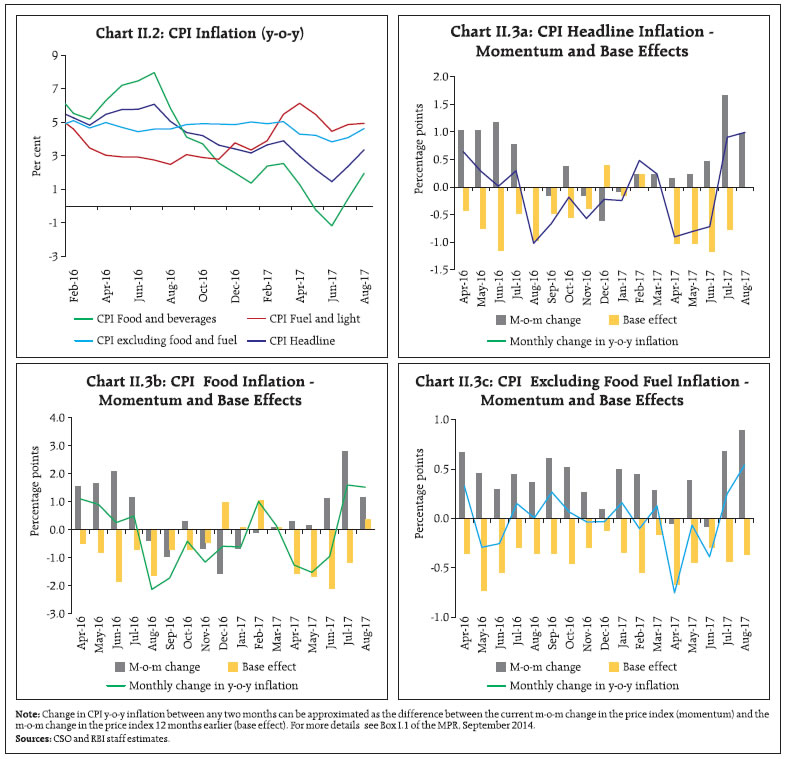 After the January 2017 trough, consumer price inflation increased for two months in succession to reach 3.9 per cent in March. Thereafter, inflation started declining sharply to reach a historic low of 1.5 per cent in June (Chart II.2), driven by the sequential decline in the momentum of food prices and the overwhelming downward pull of favourable base effects that took the prices of food items down into a deflation of (-)1.2 per cent by June. This dramatic decline was accentuated by the dampening of the usual seasonal spikes in prices of vegetables that typically manifest ahead of the onset of the monsoon. Inflation excluding food and fuel also declined sharply from 5 per cent in March to 3.8 per cent by June, after a long hiatus of stickiness. The sharp disinflation during April to June 2017 in prices of goods and services constituting this category came from favourable base effects offsetting positive but weak momentum (Chart II.3a, b and c).