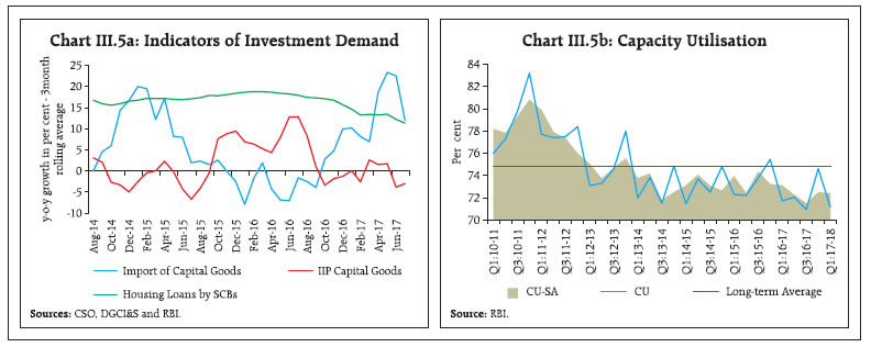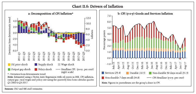 Aggregate demand has been impacted by slowing consumption demand, still subdued investment and a slump in export performance in the early months of 2017-18. Manufacturing activity, which was dragged down by one-off effects of the implementation of GST, weighed heavily on aggregate supply conditions. Notwithstanding initial deceleration, agricultural prospects remain stable and acceleration in services sector activity could impart resilience to the overall supply situation in the rest of 2017-18.