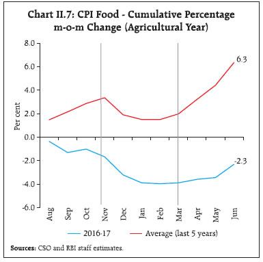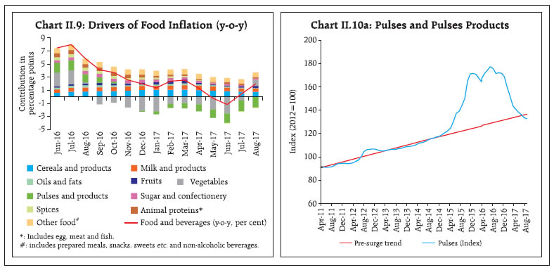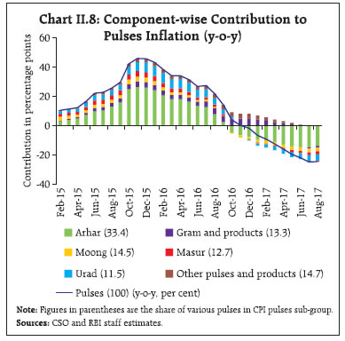 As regards specific components in the food category, pulses constitute 2.4 per cent of the CPI and 5.2 per cent of the food category. The decline in prices of pulses contributed (-)1.4 percentage points to the food deflation during May and June and (-)0.7 percentage points to headline disinflation (Chart II.9). Historically, domestic production and imports of pulses have consistently lagged behind the level of domestic demand, resulting in inflationary pressures on the headline. Drawing upon this experience, the Government put in place several measures to augment supply during 2016-17, which inter alia included increasing the minimum support prices (MSPs) to incentivise farmers to increase acreage (MSP for kharif and rabi pulses increased in the range of 7.7-9.2 per cent and 14.3-16.2 per cent, respectively, in 2016-17); continuing zero import duty on pulses to augment domestic availability of pulses at reasonable prices (import duty of 10 per cent was imposed on tur in March 2017 to prevent prices from falling below MSPs); restricting exports (tur, moong and urad dal have been made free for exports, effective September 15, 2017); creating buffer stocks of pulses for the first time through involvement of agencies such as the Food Corporation of India (FCI), the National Agricultural Cooperative Marketing Federation of India Ltd. (NAFED), and the Small Farmers’ Agri Business Consortium (SFAC); discouraging hoarding by putting stock limits on pulses for traders (which were lifted in May 2017); and taking measures for revitalising the agriculture sector in general.4