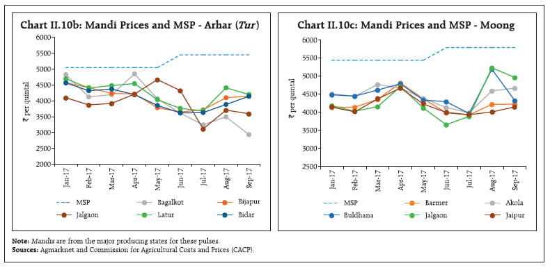 With the domestic availability of pulses (domestic production and imports) increasing to 29.6 million tonnes in 2016-17 from 22.2 million tonnes in 2015- 16, the prices of pulses declined below their long-term trend as well as the MSPs in several mandis (Charts II.10a, b and c). This reflected the large gap in procurement relative to supply and the unanticipated shock to farmers’ expectations on price support.