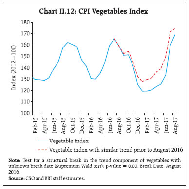 5 Monthly series of the CPI vegetable price index from January 2012 to June 2017 is decomposed into trend, cyclical, seasonal and irregular components using a univariate unobserved components model (UCM). The Supremum Wald test indicates a statistically significant break in August 2016, with the post-break trend sloping negatively. Comparing the observed vegetable price index with an index constructed by imputing the pre-break trend on to the post-break decomposition reveals a 6-10 percentage points deviation in inflation in 2017. Several caveats are in order: (i) the break is at the end of the sample; (ii) the post-break trend is negative sloping which means that reduction in prices on an enduring basis, controlling for other shocks and seasonality, is unlikely; and (iii) the July and August 2017 data already indicate a sharp reversal in vegetable prices. These need to be considered while interpreting the break as a structural change.represented as a function of deterministic trend and sum of all the shocks et. This formulation allows the decomposition of the deviation of inflation from its deterministic trend as the sum of contributions from various shocks.