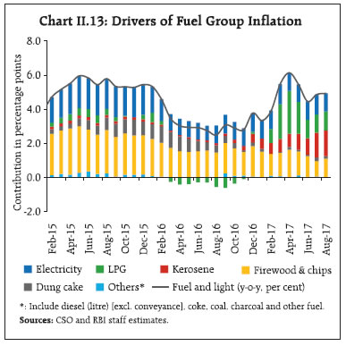 In the fuel and light group, inflation picked up at the start of the financial year but softened transiently in May-June before resuming an upturn in July and August. The decision to allow oil marketing companies (OMCs) to raise subsidised kerosene and LPG prices in a calibrated manner has enhanced the responsiveness of prices of domestic household fuel items to international price benchmarks. The contribution of electricity to overall fuel inflation remained more or less unchanged in H1:2017-18 in relation to the corresponding period of last year, while that of firewood moderated (Chart II.13). Growth in electricity generation9 decelerated during Q1:2017- 18 to 5.3 per cent (from a robust base of 10 per cent last year) on account of subdued performance of the manufacturing sector; though it has accelerated significantly in the months of July and August with a growth rate of 7.5 per cent (from 2.1 per cent last year) with reports of surge in rural demand for irrigation. The long-term thermal-based power tariff through power purchasing agreements (PPA) by distribution companies (DISCOMs), the dominant source of electricity, has remained broadly unchanged. However, spot price of electricity reported on energy exchanges, which was broadly the same as last year till April 2017, have started rising from May 2017 onwards.