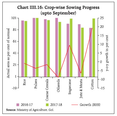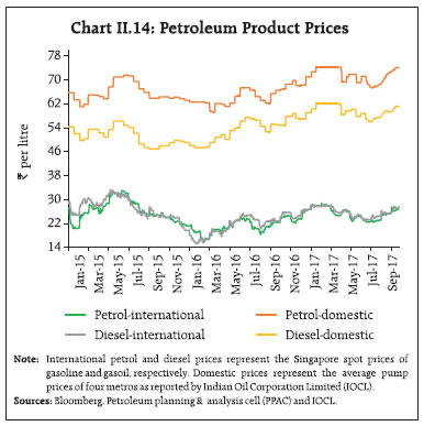 Among other industrial raw materials, domestic coal prices remained range-bound while prices of other inputs such as fibres, oil seeds and pulp either declined or moved with a softening bias; and among farm sector inputs, diesel prices declined sharply, tracking international prices. Prices of other agricultural inputs such as electricity, fertilisers, pesticides and tractors softened. Due to excess inventory, supply of fertiliser remained comfortable despite deceleration in production in Q1:2017-18 which softened prices. Tractor shipments decelerated to 8.0 per cent in Q1:2017-18 (12.1 per cent last year) largely due to destocking in the pre-GST period, with discounts imparting low momentum to prices. However, the decline in inflation in both farm inputs and industrial raw materials was arrested in the August prints as the prices of urea, high speed diesel and other minerals oil rose tracking international prices.