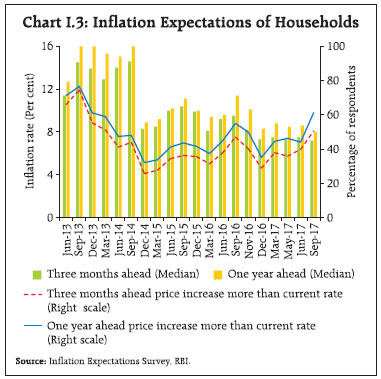 Inflation expectations of economic agents play a key role in shaping the actual outcome through wages and price-setting behaviour. Quantitative inflation expectations of urban households eased by 30-60 bps in the September 2017 round of the Reserve Bank’s survey from the June 2017 round.2 Respondent households expected inflation to be 7.2 per cent three months ahead and 8.0 per cent a year ahead. In terms of qualitative responses, however, the proportion of respondents expecting the general price level to increase by more than the current rate rose over both the three-month and the one year horizons (Chart I.3).