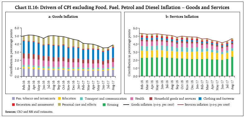 The sudden and sharp decline in inflation excluding food, fuel, petrol and diesel in Q1:2017-18 was driven by goods as well as services. Among goods, much of the moderation was in prices of personal care and effects due to a fall in the rate of change of domestic gold prices in tandem with international prices. inflation in respect of goods within the health sub-group and clothing also eased, pending price revisions held back ahead of GST, while clearance sales depressed inflation in the case of clothing (Chart II.16a).