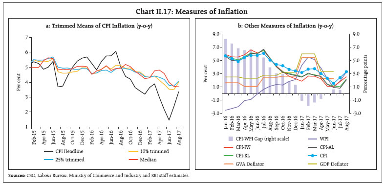 After peaking in February, WPI inflation fell sharply up to June, but ticked up again in July and August following a sharp pickup in food prices. Between April and July, CPI trimmed means11 have softened; however, in August these registered an increase. Median inflation, a particular case of the trimmed mean, also declined, averaging 4.2 per cent since March 2017 (Chart II.17a). inflation measured by sectoral consumer price indices continued to undershoot headline CPI inflation, reflecting inter alia the higher weight of food in the former. Changes in GDP and gross value added (GVA) deflators have moved along with WPI inflation since the beginning of the year (Chart II.17b). In July and August, the movement in WPI inflation was consistent with that of headline CPI and all sectoral CPIs.