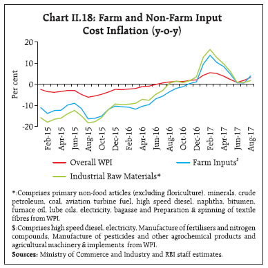 Underlying cost conditions have largely co-moved with measures of inflation, with the pickup in the last quarter of 2016-17 turning out to be transient. Industrial and farm costs captured under the WPI eased significantly in Q1:2017-18 (Chart II.18). The fall in global crude oil prices and the easing of metal prices due to the slowdown of demand from China12, the world’s biggest metals consumer, also contributed to the significant decline in domestic farm and nonfarm input costs as they got passed on to inputs such as high speed diesel, aviation turbine fuel, naptha, bitumen, furnace oil and lube oils. In Q2, metal prices rose from the June trough, underpinned by expectations of strong global demand, particularly from China. However, prices moderated somewhat by end-September.