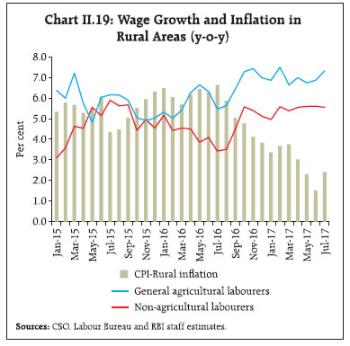 Following the monsoon and the pickup in agricultural activity, demand for agricultural labourers remained strong in 2017-18. This was reflected in a modest increase in the rate of wage growth for rural agricultural labourers, a key determinant of farm costs (Chart II.19). In the organised sector, the decline in growth of unit employee costs in listed private sector companies in manufacturing during 2016-17 reversed to register an uptick in Q1:2017-18. However, unit employee costs for companies in the services sector continued to decline in a pattern that has set in since Q2:2016-17.13 Unit labour costs14 in the manufacturing sector continued to rise as staff cost growth outpaced the growth in value of production.15 The growth in the ratio of staff costs to value of production in the manufacturing sector accelerated modestly in the first quarter of 2017-1816 after declining for the last two quarters of 2016-17 (Chart II.20). The value of production for manufacturing companies declined (probably due to de-stocking undertaken by the companies with respect to pre-GST sales) and staff costs rose marginally.