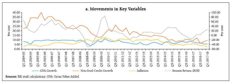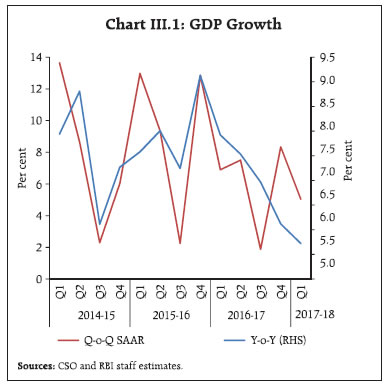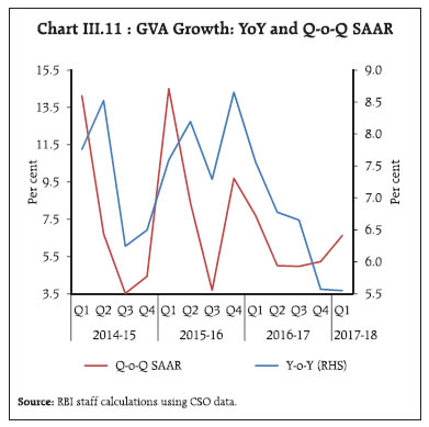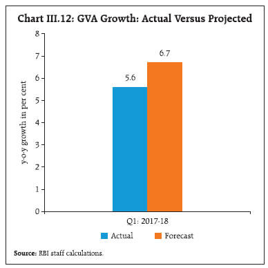 The April 2017 MPR had projected an acceleration in real GVA for 2017-18 on the back of (a) a recovery in discretionary spending spurred by the pace of remonetisation; (b) the reduction in banks’ lending rates on fresh loans brought about by demonetisation-induced liquidity; (c) the growth stimulating proposals in the Union Budget 2017-18; (d) a normal south-west monsoon; and (e) an improvement in external demand. Stressed balance sheets of banks and the possibility of higher global commodity prices were seen as downside risks to growth prospects.