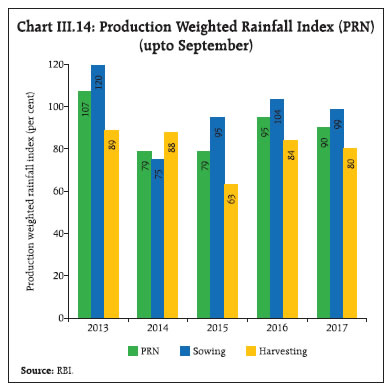 Among other food items, prices of spices moved into deflation territory since June 2017 on account of a fall in prices of chillies, dhania and black pepper. As per the 3rd advance estimates of the Ministry of Agriculture, production of spices recorded a growth of 17.4 per cent in 2016-17, up from 14.4 per cent a year ago. Sugar inflation, which was in double digits during 2016-17 (averaging 20 per cent), also eased in 2017-18 so far (up to August), largely due to measures facilitating imports and on expectations of higher domestic production. inflation in prices of animal proteins and milk has declined as momentum was weak and base effects favourable. Cereal inflation remained low and moved with a softening bias due to higher availability – production was higher and stocks were up by 5.09 million tonnes.8 Import duty on wheat that was reduced to zero in December 2016 was re-imposed in March 2017.