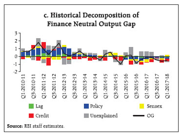 A historical decomposition3 of inflation shows that large supply shocks dominated the disinflation of the first half of 2017-18, contributing 3.6 percentage points to it. This confirms the vulnerability of the Indian economy to exogenous shocks, viz., oil prices, and disruptions impacting the agriculture sector in spite of the diversification and weather proofing of the agricultural sector sought to be achieved by policy interventions over time. These developments may warrant a re-appraisal of the scope and quality of food management strategies that seem prone to failure in the face of shocks in either direction. In the past too, supply shocks, of which large one-sided deviations of inflation from projections are merely a symptom, drove disinflation episodes. The softening of oil prices in conjunction with exchange rate appreciation and the negative output gap, possibly due to weak credit growth, also contributed to the disinflation (Chart II.6a).