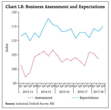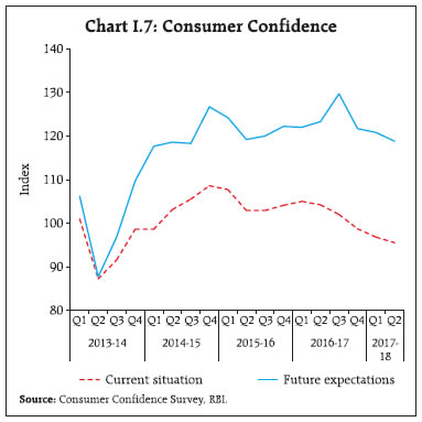 Consumer confidence dipped in the September 2017 round of the RBI’s survey on declining optimism about prospects of income and employment a year ahead (Chart I.7).6