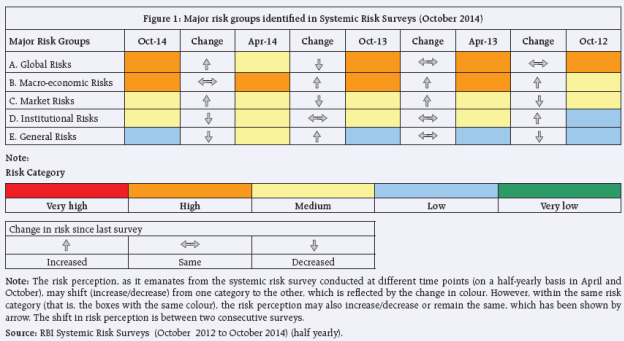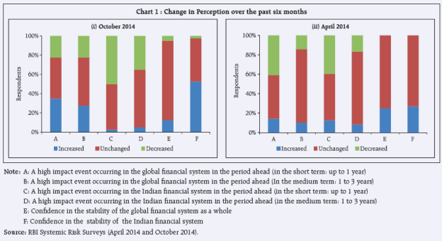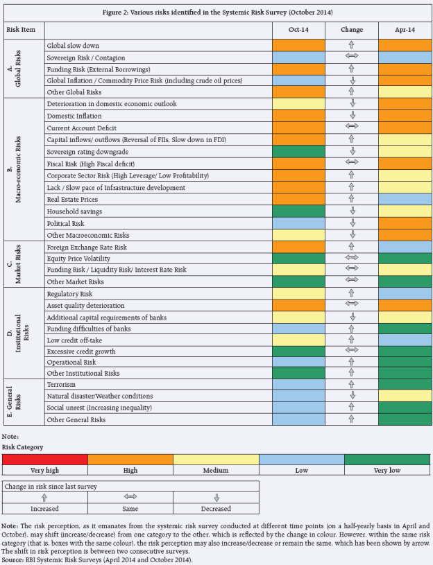 The Systemic Risk Survey (SRS), the 7th in the series was conducted in October 20141 to capture the perceptions of experts, including market participants, on the major risks that the financial system is facing. The results indi-cate that global risks and macroeconomic risks continue to be perceived as major risks affecting the financial system. Perceptions about global risks, which tapered a bit during the last survey rose once again while the same about market risks continued to be in the medium risk category, though they too looked up. General risks that had been viewed as high in the last survey mainly on account of the then prevailing uncertainties about weather conditions, were viewed as low in the current round of the survey. Institutional risks continued to fall in the medium risk category, though moderated (Figure 1). Within global risks, sovereign risks remain unchanged, while the risk of a global slowdown increased marginally. Further, the global inflation risk showed a downward trend though global funding risks remained in an elevated mode. Within the macroeconomic risk category, risks from deterioration in the domestic economic outlook receded into the medium risk category with a distinct improvement in the sovereign rating front against the backdrop of po-litical stability being in place. Surprisingly, perceptions about risks on account of CAD and fiscal deficit remained unchanged while the same about risks from domestic inflation and household savings lowered. Though the overall outlook has improved, risks emanating from the slow pace of infrastructure development, capital flows, real estate prices and the corporate sector went up to the high risk category. Among institutional risks, the asset quality of banks continued to be a concern while regulatory risk, operational risk and the risk of low credit-off-take increased comparatively. With regard to general risks, risk perceptions emanating from terrorism and social unrest have increased (Figure 2). In the current survey, participants felt that there is an increased possibility of a high impact event occurring in the global financial system in the period ahead (short to medium term) while their confidence in the global financial system has marginally deteriorated. However, the possibility of an occurrence of a high impact event in the Indian financial system in the period ahead (short to medium term) is perceived to be low with survey participants expressing higher confidence in the Indian financial system (Chart 1). On the issue of likely changes in demand for credit in the next three months, a majority of the stakeholders were of the view that it may increase but marginally. A majority of the respondents felt that the average quality of credit may improve marginally or is likely to remain unchanged in the next three months (Chart 2). 1These surveys are conducted on a half-yearly basis. The first survey was conducted in October 2011. |