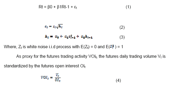 Chatrath, Ramchander and Song (1996) suggest that VOIt reflects speculative activity. Open interest largely reflects hedging activity because of its 'longer than- intraday' character. Daily trading volume represents speculation because of its short term character. By standardizing the volume by the open interest, an indicator of the relationship between speculative and hedging activity is constructed. Then Granger causality test were done for ht and VOIt. A key benefit of using the ratio, according to Garcia et al. (1986), is to avoid the potential expiration effects on trading activities, since daily trading volume and open interest are both functions of time to expiration. Additionally, Bessembinder and Seguin (1993) suggest that the volume-open interest ratio can provide insights into the trading activity generated by either speculators or hedgers in the market. Finally, Luu and Martens (2003) point out that using this ratio to measure trading activities can better capture the information arrival than trading volume or open interest alone. Reaction of the spot market to the introduction of currency futures is examined by comparing the spot volatility before and after the introduction of futures by taking the window of 366 observations before and after the event.