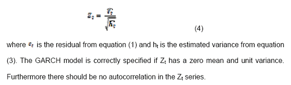 were checked for linear dependencies. To check for the presence of ARCH effect in the data we look at Ljung-Box (LB) Q-stat of the squared residual obtained from the DGP (Data Generating Process) estimated above. LB Q-stat for the various lags are significant, suggesting presence of ARCH effect. More formal test for the presence of ARCH effect is done using ARCH LM test. Null of no ARCH effect is rejected at various lags. To capture this time varying heteroscedasticity we proceed to model it using the most suitable ARCH family of model. In light of all these tests; heteroscedasticity needs to be modeled. Later on other diagnostic tests were conducted on the standardized residuals Zt from equation (2)