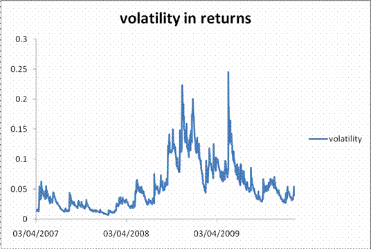 The above figure presents the graph of spot returns Rt. The augmented Dickey Fuller (ADF) statistics are negative and significant at the 1per cent level; the null hypothesis of non stationarity of the series is rejected. It is interesting to note the low level of mean and high standard error of the returns. This suggests large volatility in the currency exchange rate. To investigate whether a GARCH model is appropriate for modeling the variability of the exchange rates discussed, several tests are carried out. The residuals of the regression