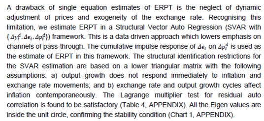| RBI Working Paper Series No. 02 @Michael Debabrata Patra Abstract Exploring nonlinearities and time variations in exchange rate pass-through (ERPT) to consumer prices in India for the period from April 2005 to March 2016, this paper finds ERPT is asymmetric with pass-through from small depreciations being the strongest. ERPT to consumer inflation has declined in recent years in an environment of low inflation and declining trade openness. A DSGE model calibrated for the Indian economy with open economy features suggests that non-linear and time-varying ERPT poses challenges for monetary policy in terms of imported inflation and policy transmission. Key words: Exchange rate pass-through, Time-varying parameter regression. JEL classification: C32, E42, F31, F33. For an open2, inflation targeting, emerging market economy (EME) like India, exchange rate pass through (ERPT) to domestic prices is a key policy parameter for at least two important reasons. First, it has implications for the central bank's goal variable - inflation formation. Also, welfare effects working through consumers' disposable incomes and corporations' input costs/profit margins feed back into informing the setting of optimal monetary policy. Secondly, it influences the degrees of freedom available for conducting monetary policy in pursuit of domestic objectives - should the central bank sacrifice independence and respond to an exchange rate change even though it is not targeting the exchange rate? Yet, the inflation target itself could be threatened by the exchange rate change! Instantly, the trilemma comes alive. Quite naturally, the role of ERPT in the conduct of monetary policy has attracted prolific research attention; we have been chasing this mirage for over a decade (Khundrakpam, 2007; Patra and Kapur, 2012; Patra et al., 2014; John, 2015). The impetus for this surge of interest developed as this literature slipped its microeconomic moorings in industrial organisation in the late 1990s, led by an influential view that ERPT is endogenous to the monetary policy regime (Taylor, 2000). Since then too, the literature has shed its predominantly advanced economy focus and has acquired an abiding interest in ERPT in emerging economies. Repetitive visitations of generations of currency crises since the 1990s have not deterred EMEs from adopting floating exchange rate regimes and 'managing' them in preference to 'fixing', dispelling influential scepticism embodied in the fear of floating (Calvo and Reinhart, 2000; 2002) and the loss of monetary policy independence. It turned out that they had found the circuit-breaker - inflation targeting! The commitment to a numerical inflation target, and the collateral credibility it brought, anchored expectations and kept inflation variance subdued. Consequently, ERPT itself moderated for EMEs, suggesting reverse causality – from the monetary policy regime to ERPT, a la Taylor! In the ultimate analysis, ERPT is an empirical issue. The eclectic policy maker having to deal with it on operational terms is naturally wary about choice of methodology, controls, restrictions, time frame and stability of the estimates over space and time. Just as the empirical literature was coalescing around a settled position - that ERPT is delayed and incomplete; that it is low and stable in advanced economies (AEs), higher but declining in EMEs (Devereux and Yetman, 2008; Mihaljek and Klau, 2008; Lopez-Villavicencio and Mignon, 2016) – one strand has put a finger to the wound. Since the taper tantrum of the summer of 2013, global spillovers from ultra-accommodative monetary policies of systemic central banks have triggered large and sudden risk-on-risk-off swings in investor sentiment and asset prices, especially exchange rates. In this setting, evidence has been turned in on higher exchange rate volatility being associated with higher ERPT and axiomatically, with higher inflation variability (Campa and Goldberg, 2005; Bussiere, 2013; Cheikh and Rault, 2015; Jasova et al., 2016). Consequently, the standard approach of estimating ERPT as linear and symmetric could be biased towards overestimation as it would also pick up changes in exchange rate volatility. In contrast to the relative neglect in the standard literature, recent studies are putting out persuasive evidence that non-linearities cannot be neglected. Price rigidities and pricing to market strategies are found to impart convexity to ERPT, while switching costs - low elasticity of substitution between domestic and foreign goods - could give it concavity (Bussiere, 2013). One variant of non-linearity takes the form of asymmetries in ERPT. Asymmetric effects can be directional - the proportionate pass through of depreciations to inflation is different from that of appreciations (Khundrakpam, 2007). Also, there is compelling evidence that while the direction of asymmetry may vary at the firm level, size does matter - inflation may respond to large exchange rate changes differently than to small changes (Pollard and Coughlin, 2004). It has also been argued that the mainstream empirical literature captures only time-invariant factors - such as firms' pricing power - through fixed effects (Cheikh and Rault, 2015; Jasova et al., 2016). In reality, ERPT is determined by factors such as the stage of the economic cycle; monetary policy regime shifts; the market structure; and the composition of imports; all of which produce secular movements. Consequently, it becomes important to assess the stability of ERPT estimates over time. By abstracting the possibility of temporal shifts in the relationship between the exchange rate and macro variables, the mainstream literature embeds bias (Mumtaz and Sunder-Plassman, 2013). This is of particular relevance in periods characterised by large shocks, changes in transmission channels and regime shifts which are unlikely to be accounted for by a fixed-coefficient model. Against this backdrop, let’s cut to the chas
