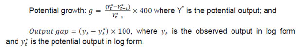 The above equations (5) to (9) can be conveniently translated into a state-space model and estimated using maximum likelihood to derive unobservable variables like potential output, potential growth and output gap. Production Function An alternative to the above statistical methods, the potential output could be estimated using structural approach on the basis of a production function. Let us consider a Cobb-Douglas production function: yt = αlt + (1 - α)kt + tfpt (10) where all the variables are in logarithms, yt is output, lt is effective labour employed, kt is capital stock at time t and tfpt is total factor productivity. While α measures the labour share, (1 - α) measures the capital share. The above Cobb-Douglas production function assumes constant returns to scale. The estimation of potential output involves a few steps: (i) estimation/ determination of labour share based on historical data; (ii) estimation of total factor productivity as Solow residual (i.e. output less the weighted sum of labour and capital inputs); (iii) derivation of trend of total factor productivity and potential labour and capital; and (iv) potential output is estimated based on the values of coefficient and variables obtained in the previous step. However, production function approach is subject to criticisms as it is based on a few assumptions about the functional form, potential labour and capital. The method also uses simple detrending procedures like the HP filter to obtain potential labour or trend productivity, which has a significant bearing on the gap estimate. Once potential output is estimated, the potential growth and output gap can be derived by taking percentage change of the potential output and taking percentage deviation of actual output from its potential level, respectively. Thus, the potential growth and output gap are worked out as: