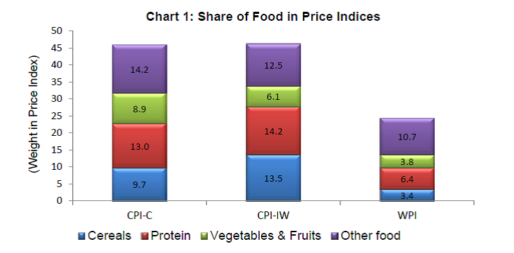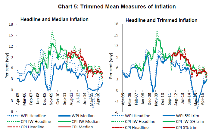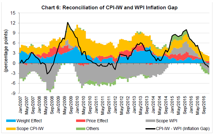 | Press Release RBI Working Paper Series No. 05 @Praggya Das and Abstract ♣ A key feature of the inflationary process during 2015-16 was the large divergence in the Consumer Price Index (CPI) and Wholesale Price Index (WPI) inflation. The CPI-WPI divergence resulted in considerable debate amongst policy makers and academia on its causes and its implications for monetary policy. In this context, this paper provides a comparative assessment of CPI and WPI in terms of its key characteristics, particularly on the method of compilation, distributional properties and measures of underlying inflation. The paper further attempts a full reconciliation of inflation divergence between CPIs and WPI with particular emphasis on 2015-16. The analysis shows that differences in weight for similar items as well as differences in composition played a crucial role in determining the level and duration of observed divergence between the retail and wholesale prices inflation. JEL Classification Numbers: E30, E31, E50 Keywords: Consumer Price Index, Wholesale Price Index, Inflation, Flexible Inflation Targeting, Monetary Policy Introduction Inflation in India, as measured by annual changes in wholesale and retail prices, averaged 7.2 per cent and 8.0 per cent, respectively, in the last four and a half decades, which in comparison with other emerging market economies is noteworthy, and by developed country standards relatively high (Basu, 2011). Generally, the retail and wholesale price measures in India moved in coherence, though there were instances of periodic divergences (Table 1). In the period following the global financial crisis, retail and, with a lag, wholesale inflation, became unhinged from their pre-crisis averages and hovered around double digits for four successive years. The high and rising inflation persistence set the stage for an intense debate on nature of post-crisis inflation in India and its implications for macro-stability and policy1. This culminated with the setting up of the Expert Committee to Revise and Strengthen the Monetary Policy Framework (Chairman: Dr. Urjit R. Patel) on September 12, 2013 with a mandate, inter alia, to recommend an appropriate nominal anchor for the conduct of monetary policy. The Committee, recommended headline CPI-combined2 as the nominal anchor for monetary policy and set out a glide path3 to bring down inflation. Following the recommendations of the Expert Committee, in January 2014, the Reserve Bank started to pursue a glide path for disinflation expressed in terms of headline CPI-combined for medium term monetary policy. Subsequently, on February 20, 2015, the Agreement on a flexible inflation targeting framework for monetary policy between the Government of India (GoI) and the Reserve Bank, formalised CPI-combined inflation as the nominal anchor for monetary policy (GoI, 2015) and on May 14, 2016, the same was explicitly mandated by an amendment to the Reserve Bank of India Act, 1934 (GoI, 2016). In this context of the shift in monetary policy framework towards flexible inflation targeting with a nominal anchor based on CPI, the period from late 2014 onwards also saw a sustained divergence in inflation as measured by the WPI and the CPI. While CPI inflation moderated in line with the disinflation glide path and reached 5.2 per cent by January 2015; since November 2014, WPI turned into deflation territory, resulting in the average gap between wholesale and retail inflation, which was historically less than one percentage point, to rise to as high as 8 percentage points during 2015. The stark divergence in WPI and CPI inflation, especially at a time when the country was transiting to a flexible inflation targeting framework, invited considerable debate on its implication for macro-economic policy, particularly monetary policy. The Chief Economic Adviser, GoI was of the view that “in terms of the prices measured by the national income accounts, we are closer to deflation territory and far, far away from inflation territory4” and that “this diverging wedge (between CPI and WPI) is not completely understood5”. The implications for policy on account of the diverging movements in WPI and CPI was aptly summarised by Mr. Prannoy Roy in a panel discussion6 with Governor and the Chief Economist Adviser where he posed the question to the then Governor, Dr. Raghuram Rajan that “...if you take CPI as the authentic measure of inflation, you are worried about inflation, so you will not lower interest rates and if you take WPI as authentic you will lower interest rates as you are not worried about inflation – a huge impact on policy?” In reply, Governor noted “…if you are really interested in protecting the consumer, and thereby worrying about either his investment decisions or his consumption decisions, I think the CPI is probably what you should be looking at, rather than intermediate prices”. While there has been considerable print on the broad factors that contributed to the inflation divergence, there has not been much literature identifying and quantifying the factors that cause wide divergence during some periods and complete convergence during the other. One of the recent studies that explained the divergence between retail and wholesale prices was carried out by Kumar and Sinha (2015). The study focussed on the movements of similar items in WPI and CPI-combined, and its divergence was largely attributed to the difference in weights of the two indices and difference in prices of common items; and items that moved differently in the two series were identified. This paper contributes to the literature by providing a comprehensive assessment of wholesale and retail prices in India and the sources of divergence. The rest of the paper is organised as follows. Section II presents a brief history of the production and use of price indices in India and their distributional properties. Section III gives the methodology for analysis and presents the