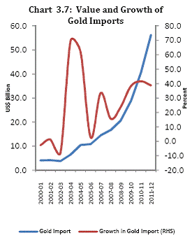 3.12 As regards the underlying factors for explaining international gold prices, studies suggest that the international gold price is a complex phenomenon affected by economic and political environment. While in the short-run, trend in gold prices could be due to inter-commodity substitution on account of movement in their relative prices, in the long-run, gold can be used as an instrument to hedge against inflation. History shows that during periods of financial turbulence, gold becomes an attractive asset class for investment. More recently, after the 2008-09 financial crisis, the demand for gold as collateral has also increased as it does not involve credit risk and its price generally exhibits counter-cyclical behavior. Similarly, transparent pricing of gold as compared to other assets may also be another positive factor for its demand. Trends in imports of gold 3.13 There has been a sharp increase in India’s gold imports in the recent past, which has raised concerns about its implications for trade deficit. As per DGCI&S data, the imports of gold increased from US$ 40.5 billion during 2010-11 to about US$ 56.2 billion during 2011-12 (Chart 3.7). The rise in India’s import of gold has been on account of both price and quantum factors. International gold prices on average rose by 27.2 per cent in US dollar terms (34.0 per cent in INR terms) during 2011-12 as compared with 26.4 per cent in US dollar terms (21.6 per cent in INR terms) cent during 2010-11. As far as quantum of gold import is concerned, it is estimated to have increased by 9.2 per cent in 2011-12 (12.0 per cent in 2010-11). As shown in Chart 3.8, volume of gold import has surged in recent years despite sharp increase in gold prices. It implies that gold imports of India are relatively price inelastic.