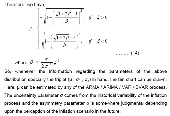 a) Central view This is usually expressed as a particular projected path based on a model that maps choices about economic assumptions onto an inflation forecast. Since no single projection at a future date has much chance to match with the subsequent outcome, one should take into account the full range of possibilities. Towards this, one uses the mode forecast instead of mean forecast, as mode is the more likely value in the sense that it maximizes the probability density function. This mode forecast has some drawbacks as it uses less information about the distribution and therefore is less sensitive to unlikely outcomes, e.g., if the distribution is multimodal, it would select only one peak and ignore the other peaks. Also mode does not have asymptotic justification like the mean as a measure of central tendency. However, the first drawback is not a serious concern as long as the distribution is unimodal and not too flat. Second, we can say that, the main use of asymptotic theory is in the inference problem when the finite-sample distribution is unknown. But it is not a problem when the distribution is known. Rather, our problem is on how best to estimate the parameters of the distribution. b) Degree of uncertainty This is the degree of dispersion in the distribution that can be measured by variance or mean absolute error or inter-quartile range of the historical data. Among these three, we prefer the variance. Uncertainty is a forward looking view of the risk as it tells how the future events will differ from the central view. The variance of the forecast distribution is determined from the standard deviation of the historical forecast errors and initially taken as fixed. c) Balance of risk In case of symmetric distribution, i.e., if the risk is symmetrically distributed around the central view, the more likely forecast will coincide with the mean forecast. But in case of asymmetric distribution, i.e., if risk is unbalanced, the more likely value differs from the average. If the balance of risk is on the upside, the mean forecast will be higher than the mode and the distribution will be positively skewed and if the balance of risk is on downside, the mean forecast will be lower than the mode and the distribution will be negatively skewed. In this section, we discussed about the underlying distribution of fan chart. Generally, split normal or two-piece normal distribution is used in this respect. There are several equivalent parameterizations for the split-normal distribution. Here we study only two of them in details and establish the parametric relationship between them. ![]() ![]() ![]() ![]() 4. Use of Fan Chart in Different Countries Fan chart is a very useful map for any inflation-targeting central bank. Bank of England uses Fan Chart in its Inflation Report since February 1996 to represent their inflation forecast. Indeed fan chart of Bank of England is considered as pioneering in the field of inflation analysis. Sveriges Riksbank (BoS) is also publishing similar density forecasts of inflation in its Inflation Report since December 1997. The cases of United Kingdom and Sweden are benchmarks for balance of risk analysis. Instead of taking symmetric forecasting distributions, they considered asymmetry and based on current developments and the future outlook, they made assumptions about the central value of the distribution, the variance and the degree of asymmetry. Since 2008, European Central Bank (ECB) bringing out inflation dynamics in the form of fan charts. Apart from the inflation forecast, fan chart is also used to illustrate the prospective density function of future male survival rates by Blake, Dowd and Cairns (2008) using mortality data for England and Wales. They found that, taking account of uncertainty in the parameters of the underlying mortality model leads to major increases in estimates of the widths of the Fan Chart. 5. Application of Fan Chart to Indian Context As an empirical illustration in Indian context, forecast distribution of WPI-based inflation forecasts is presented in the form of a fan chart. The baseline forecast is based on a vector auto-regression (VAR) model using monthly data on WPI, IIP, REER and M1. The program for computation and representation of fan chart is developed using MS Office Excel 2003 in Visual Basic. Based on the latest WPI data available till March 2011, fan chart is represented. The mode values or the more likely values were estimated from the VAR model as mentioned earlier. All other parameters of the forecast distribution are presented in Table 1 which form the inputs for fan chart representation.
