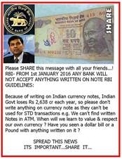 The Reserve Bank of India has today denied having issued a communication circulating on social media alerting members of public that banks will not accept currency notes with scribbling on them from January 1, 2016. The Reserve Bank has reiterated that all currency notes issued by it are legal tender and banks and members can freely and without fear accept them in exchange for goods and services. ![]() Figure 1: This message is incorrect The Reserve Bank has also stated that in pursuance of its clean note policy, it keeps requesting banks and members of public not to write on the currency notes as writing defaces them and reduces their life. Audio of Governor Dr. Raghuram G. Rajan refuting the rumour Alpana Killawala Press Release: 2015-2016/1400 |